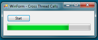 To demonstrate this we have a simple WinForms application. It consists of a Form with a button for starting a long running task and a progress bar for showing the progress of that task as it executes. The button1_Click event handler creates a thread pool work item in order to kick off the LongProcess1 method in a separate worker thread. We simulate a long running operation by placing a Thread.Sleep inside a loop and repeatedly call the ProgressUpdate1 method to update the progress bar with current state of the task.