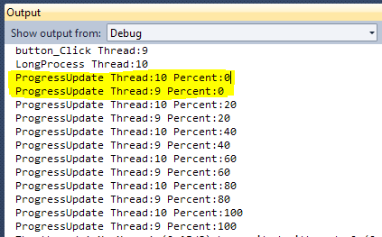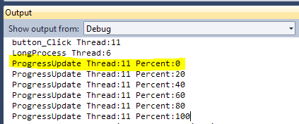 Console.WriteLine("ProgressUpdate Thread:{0} Percent:{1}",