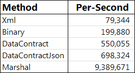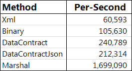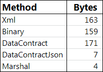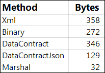 Swapping the XmlSerializer for the BinaryFormatter, DataContractSerializer and DataContractJsonSerializer classes gives us the output size for those alternatives. Our final option for comparison is to write our own serializer that is as fast and concise as possible. This acts as a benchmark for comparing the maximum possible performance against the available implementations. My implementation uses the Marshal class to create an unmanaged copy of the structure and then copy the unmanaged bytes back to managed code as a byte array.