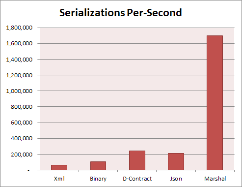 So the only real choice to be made is between using the DataControlSerializer that outputs to Xml or the Json variation. Json produces more compact output but Xml is a better known standard with better tools available for consuming it. The project requirements would likely make this decision for you. If only there was a serializer based on the Marshal style approach we would be able to get the smallest possible output size and lightning fast performance. A graph of relative performance shows just how handy that would be.